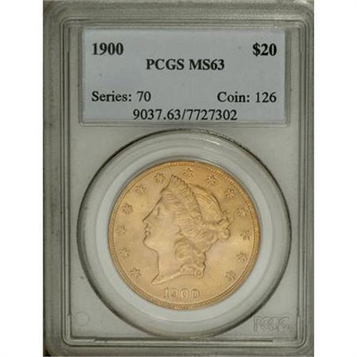 <B>1900 $20 MS63 PCGS.</B></I> PCGS Population (6974/2774). NGC Census: (9301/3102). Mintage: 1,874,584. Numismedia Wsl. Price for NGC/PCGS coin in MS63: $920. (#9037)<BR><BR><B>Coin Engraver:</B> James B. Longacre<BR><BR><b>Shipping:</b> Coins & Currency (<a target="_blank" href="http://www.heritageauctions.com/common/shipping.php">view shipping information</a>)