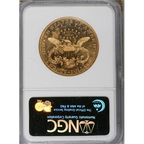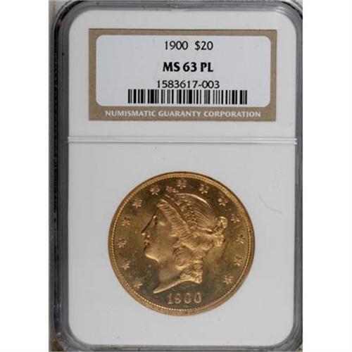 <B>1900 $20 MS63 Prooflike NGC.</B></I> A flashy Select example with a few inconspicuous marks near Liberty's jaw. Well struck aside from the centers of a few obverse stars. NGC has certified only four 1900 twenties as Prooflike, with the present piece as the single finest among those (7/07).<BR><BR><B>Coin Engraver:</B> James B. Longacre<BR><BR><b>Shipping:</b> Coins & Currency (<a target="_blank" href="http://www.heritageauctions.com/common/shipping.php">view shipping information</a>)