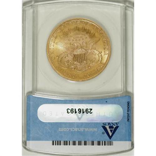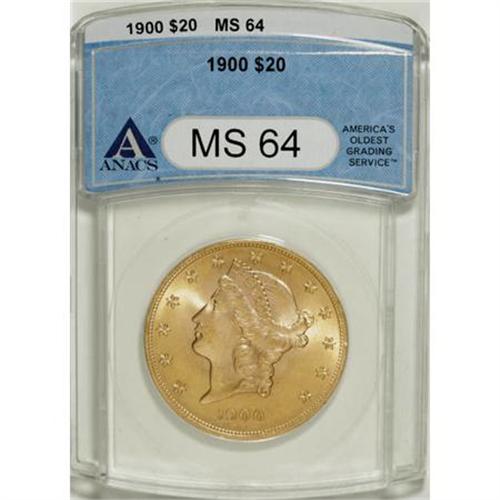 <B>1900 $20 MS64 ANACS.</B></I> Dazzling luster emanates from peach-gold surfaces tinted with hints of light tan. Sharply struck throughout, further enhancing this near-Gem's eye appeal. A few minute marks preclude a higher grade.<BR><BR><B>Coin Engraver:</B> James B. Longacre<BR><BR><b>Shipping:</b> Coins & Currency (<a target="_blank" href="http://www.heritageauctions.com/common/shipping.php">view shipping information</a>)