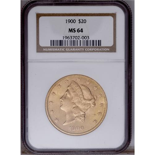 <B>1900<$20> MS64 NGC.</B></I> Creamy surfaces with blushes of pale pink-orange color here and there over each side. A high-end specimen, less abraded than many examples grading a point higher.