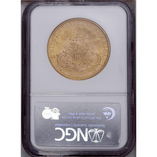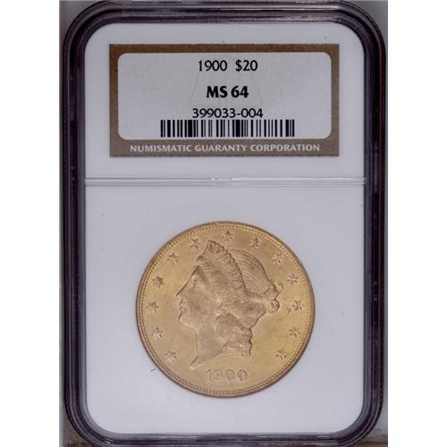 <B>1900 $20 MS64 NGC.</B></I> Frosty luster emanates from yellow-gold surfaces that are well struck, with all star centrils bold and Liberty's hair well sculpted. An interesting piece: zealous reverse die lapping has effaced portions of the two bottom-left (facing) wing feathers and the bottom-right tail feather.