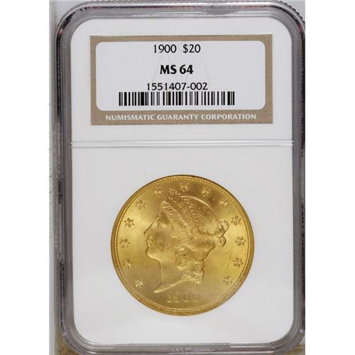 1900 $20 MS64 NGC. Glowing luster embraces both sides