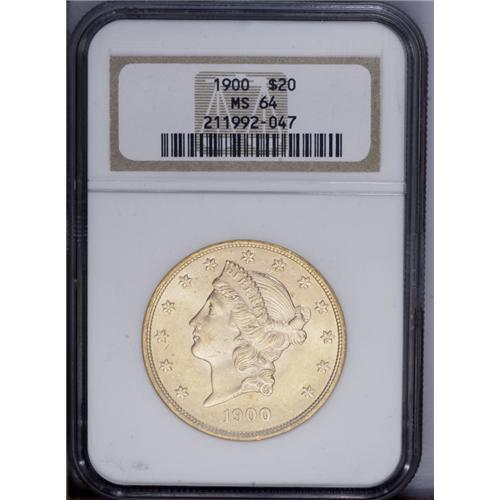 <B>1900<$20> MS64 NGC.</B></I> Vibrant cartwheel sheen endows this thoroughly lustrous and carefully preserved Liberty twenty dollar piece. A solitary dash of peach toning is noted above the date.