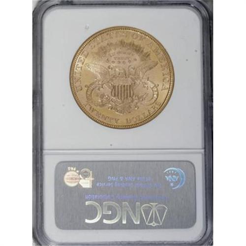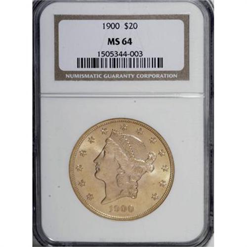 <B>1900 $20 MS64 NGC.</B></I> A flashy and carefully preserved near-Gem with impressive eye appeal. Boldly struck and attractive. Although an available issue, the 1900 is about ten times scarcer than the 1904 in Mint State.<BR><BR><b>Shipping:</b> Coins & Currency (<a target="_blank" href="http://www.heritageauctions.com/common/shipping.php">view shipping information</a>)