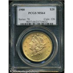 1900 $20 MS64 PCGS. Although the 1900 is not a rar <B>1900 $20 MS64 PCGS.</B></I> Although the 1900 is not a rare date among Liberty Double Eagles, only a minute percentage of survivors can match the exceptionally undisturbed surfaces of this exquisitely struck and lustrous representative. A prize for the specialist or type collector. <BR><BR><B>Important notice:</B> Heritage usually auctions material at the rate of 200-250 lots per hour. On some occasions eBay Live bid software or the Internet may not be able to keep up with the pace of the auction. We recommend placing a realistic absentee bid now as insurance to avoid disappointment. Occasionally the auctioneer may eliminate or reject an eBay Live bid, and the auctioneer may also reopen a lot after the close of the eBay live bidding (usually because we missed an audience bid), and may reject your bid even if it shows you as the winning bidder. By bidding via eBay Live, you agree that Heritage may award the lot to another bidder at its sole discretion under the circumstances described above or any other reasonable circumstances. Since eBay bids are not shown to us until we open the lot on the floor, we treat those bids just like floor bids. In most cases the floor responds before the eBay bid is presented to us, due to Internet lag time, so for consistency we have made it a policy that floor bids are always considered first over tie eBay live bids. Also please note that all Heritage lots purchased through eBay Live carry a 20% Buyer's Premium. Please make sure you read the Terms and Conditions before you bid. This lot is being auctioned in conjunction with a live floor auction by Heritage Galleries & Auctioneers. All final auction and invoice information will be supplied by Heritage Galleries & Auctioneers, and all other information should be considered preliminary. Lot:7002