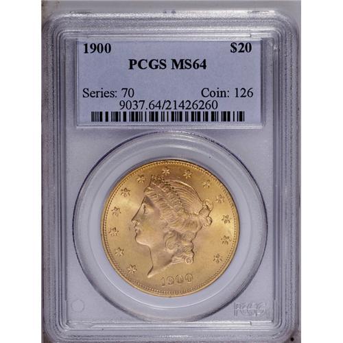 <B>1900<$20> MS64 PCGS.</B></I> Boldly impressed and satiny, this is one of the more readily available late date Coronet double eagles at the near-Gem level of preservation. Despite a couple of abrasions on Liberty's cheek and jaw, the surfaces are quite smooth and the overall eye appeal of this example is well above average.