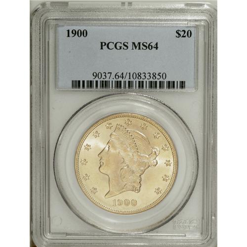 <B>1900 $20 MS64 PCGS.</B></I> Choice and boldly struck with small, scattered marks on the highly lustrous straw-gold surfaces. A desirable example of this Type Three double eagle.<BR><BR><b>Shipping:</b> Coin/Currency (<a target="_blank" href="http://www.heritageauctions.com/common/shipping.php">view shipping information</a>)