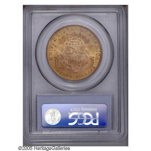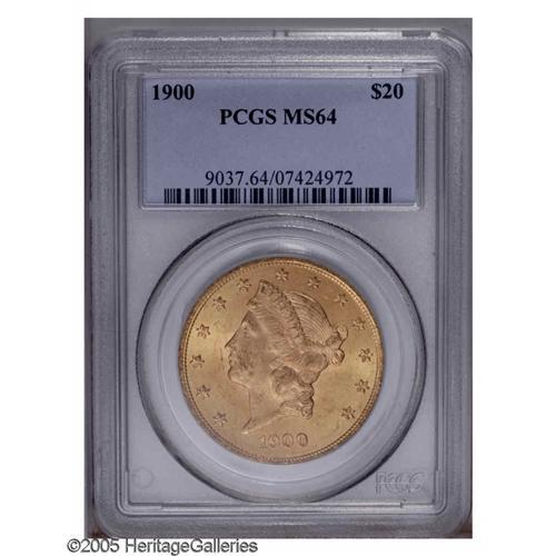 <B>1900<$20> MS64 PCGS.</B></I> Much cleaner than the typical Mint State Liberty Twenty, this original example also features greenish-gold and apricot toning. Moderate marks are noted near the profile and to the right of the date.