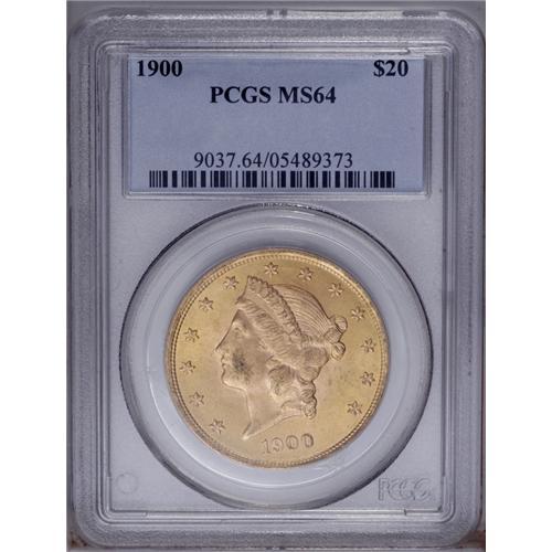 <B>1900<$20> MS64 PCGS.</B></I> Pleasantly smooth green-gold surfaces ensure the quality of this shimmering and sharply struck turn of the century type coin. Slight discoloration on the cheek is all that limits the grade.