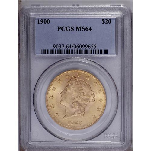 <B>1900 $20 MS64 PCGS.</B></I> Radiant luster with appealing green-gold, frosty surfaces, a bold strike, and only a few trivial ticks on the highpoints distinguish this attractive, strictly graded near-Gem coin.