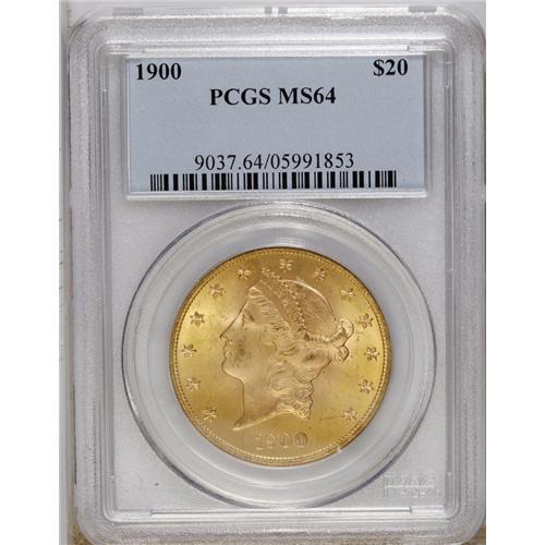 <B>1900 $20 MS64 PCGS.</B></I> Satiny honey-gold luster bathes each side of this attractive near-Gem. Exquisitely struck design elements further enhance the eye appeal.<BR><BR><b>Shipping:</b> Coin/Currency (<a target="_blank" href="http://www.heritageauctions.com/common/shipping.php">view shipping information</a>)