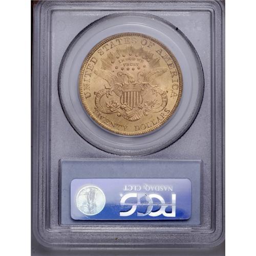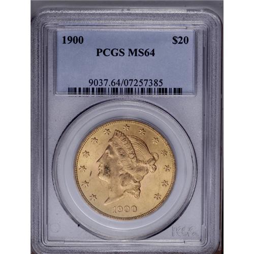 <B>1900<$20> MS64 PCGS.</B></I> Satiny with luscious mint-green and rose toning, the design features are crisply struck and the reverse is Gemlike, while an abrasion on Liberty's cheek prevents the MS65 assessment. A small grease stain (as struck) is noted in the left obverse field. <BR><BR><B>Important notice:</B> Heritage usually auctions material at the rate of 200-250 lots per hour. On some occasions eBay Live bid software or the Internet may not be able to keep up with the pace of the auction. We recommend placing a realistic absentee bid now as insurance to avoid disappointment. Occasionally the auctioneer may eliminate or reject an eBay Live bid, and the auctioneer may also reopen a lot after the close of the eBay live bidding (usually because we missed an audience bid), and may reject your bid even if it shows you as the winning bidder. By bidding via eBay Live, you agree that Heritage may award the lot to another bidder at its sole discretion under the circumstances described above or any other reasonable circumstances. Since eBay bids are not shown to us until we open the lot on the floor, we treat those bids just like floor bids. In most cases the floor responds before the eBay bid is presented to us, due to Internet lag time, so for consistency we have made it a policy that floor bids are always considered first over tie eBay live bids. Also please note that all Heritage lots purchased through eBay Live carry a 20% Buyer's Premium. Please make sure you read the Terms and Conditions before you bid. This lot is being auctioned in conjunction with a live floor auction by Heritage Galleries & Auctioneers. All final auction and invoice information will be supplied by Heritage Galleries & Auctioneers, and all other information should be considered preliminary. Lot:4396 <BR><BR><B>Winning Notification and Billing:</B> After the FINAL session in this auction is complete, Heritage will send e-mail and snail mail invoices. This process normally takes several days. All final auction and invoice information will be supplied by Heritage Galleries & Auctioneers, and all other information should be considered preliminary. <BR><BR>This auction will be conducted on a live auction floor and over the Internet through eBay Live. If you choose to place an absentee bid, please take a moment to <font color='#0000ff'><u><a href='http://pages.ebay.com/liveauctions/help/before/laabsentee.html'>learn how eBay Live absentee bidding works</a></u></font><font color='#000000'>