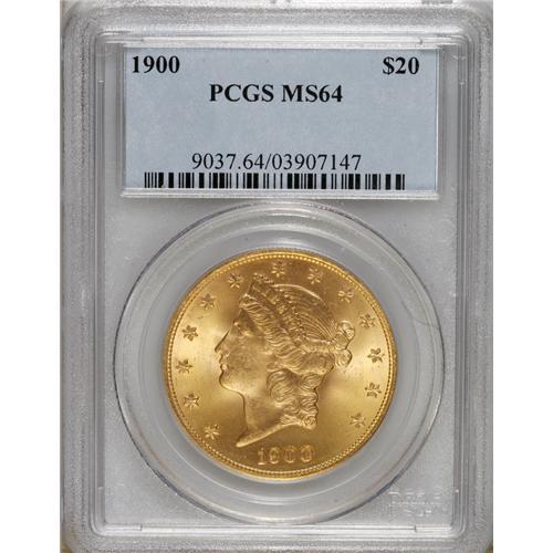 <B>1900 $20 MS64 PCGS.</B></I> The 1900 twenty dollar is one of the most common of the Liberty Head type. Glowing luster emanates from peach-gold surfaces imbued with wisps of light tan, and sharply struck design elements are apparent throughout. Some minute obverse marks limit the grade.<BR><BR><b>Shipping:</b> Coins & Currency (<a target="_blank" href="http://www.heritageauctions.com/common/shipping.php">view shipping information</a>)