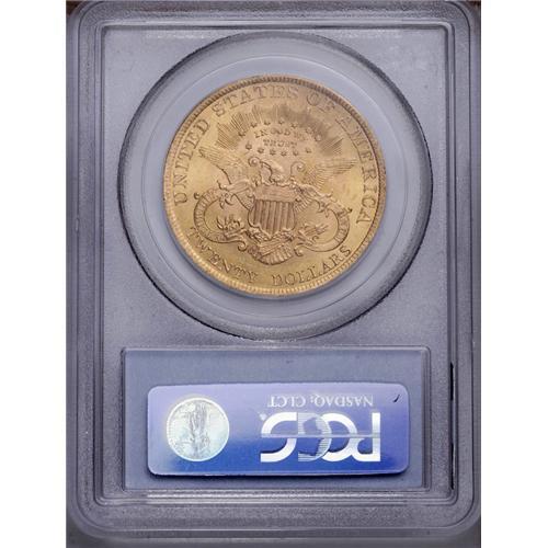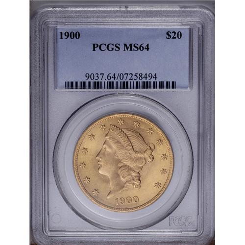 <B>1900<$20> MS64 PCGS.</B></I> This impressive khaki-gold Liberty twenty gives the initial appearance of a full Gem, and only thorough evaluation locates a short concealed scratch near the hair bun that limits the grade. Nevertheless, the eye appeal is formidable for the MS64 level.