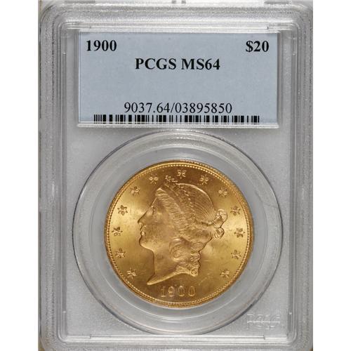 <B>1900 $20 MS64 PCGS.</B></I> This is a sharply detailed Choice Mint State piece with frosty yellow luster. The date is common at this grade level but rare any finer. PCGS has only certified 51 better examples of this issue (4/07).<BR><BR><b>Shipping:</b> Coins & Currency (<a target="_blank" href="http://www.heritageauctions.com/common/shipping.php">view shipping information</a>)