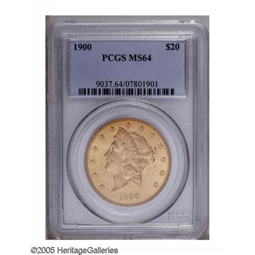 <B>1900<$20> MS64 PCGS.</B></I> This lovely near-Gem offers dusky peach-gold color. Satin luster is intense and comprehensive, and the strike is exemplary. Although the 1900 will never be a rarity in Mint State, it is not often encountered with the present quality.
