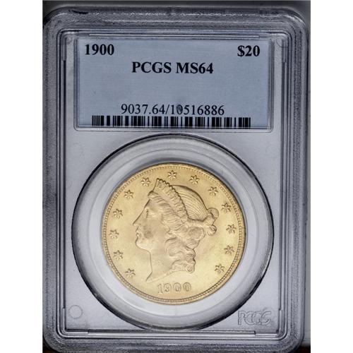 <B>1900<$20> MS64 PCGS.</B></I> Well struck with pale greenish-yellow and pink toning on both sides. Lustrous and nicely preserved with a few trivial marks on the obverse. A popular turn-of-the-century date.