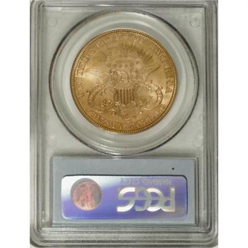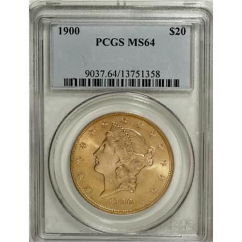 <B>1900 $20 MS64 PCGS.</B></I> The pale yellow-gold surfaces of this shining near-Gem show faint green accents. This solidly struck Philadelphia double eagle shows a number of grade-defining marks, including one on the ear. Difficult any finer, as PCGS has graded just 54 finer examples (8/07).<BR><BR><B>Coin Engraver:</B> James B. Longacre<BR><BR><b>Shipping:</b> Coins & Currency (<a target="_blank" href="http://www.heritageauctions.com/common/shipping.php">view shipping information</a>)