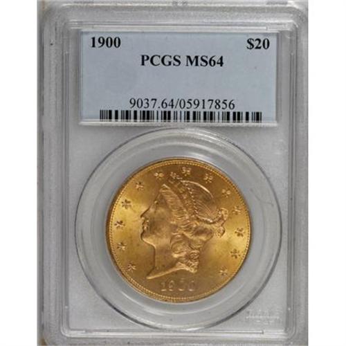 <B>1900 $20 MS64 PCGS.</B></I> Well struck and highly lustrous, with pleasing orange-gold toning and nicely preserved surfaces for the grade. A few trivial luster grazes and bagmarks occur on each side. A pleasing near-Gem representative of this popular turn-of-the-century issue. <BR><BR><B>Coin Engraver:</B> James B. Longacre<BR><BR><b>Shipping:</b> Coins & Currency (<a target="_blank" href="http://www.heritageauctions.com/common/shipping.php">view shipping information</a>)