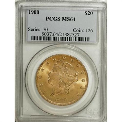 <B>1900 $20 MS64 PCGS.</B></I> Decisively struck and shining with outer zones of orange-gold around lighter yellow-gold centers. Despite a mintage of almost 1.9 million pieces, this issue is surprisingly unavailable in better grades; PCGS has graded just 56 coins finer (10/07).<BR><BR><B>Coin Engraver:</B> James B. Longacre<BR><BR><b>Shipping:</b> Coins & Currency (<a target="_blank" href="http://www.heritageauctions.com/common/shipping.php">view shipping information</a>)