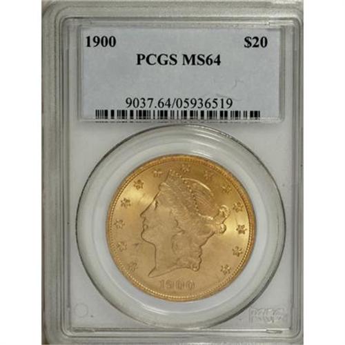 <B>1900 $20 MS64 PCGS.</B></I> PCGS Population (2818/56). NGC Census: (2966/187). Mintage: 1,874,584. Numismedia Wsl. Price for NGC/PCGS coin in MS64: $1,760. (#9037)<BR><BR><B>Coin Engraver:</B> James B. Longacre<BR><BR><b>Shipping:</b> Coins & Currency (<a target="_blank" href="http://www.heritageauctions.com/common/shipping.php">view shipping information</a>)
