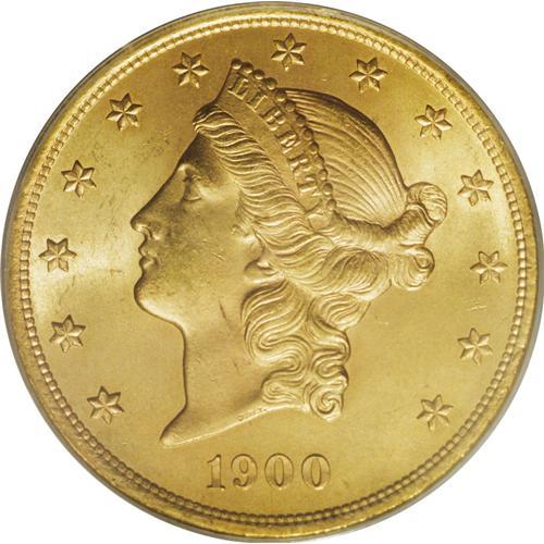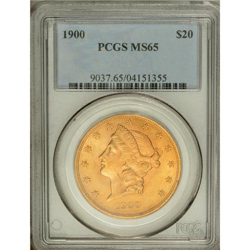 <B>1900 $20 MS65 PCGS.</B></I> The eye of the viewer is immediately drawn to the splendid, subtly variegated toning scheme, that includes lime-green and peach as two of its primary colors. The distinctly matte-like surfaces are bright and highly lustrous. A strong striking impression is implied by the uniformly crisp design details, and minimal marks are found on either side. A lovely, beautifully preserved Gem. Population: 50 in 65, 2 finer (11/06).<BR><I>From The Kutasi Collection.</B></I><BR><BR><b>Shipping:</b> Coin/Currency (<a target="_blank" href="http://www.heritageauctions.com/common/shipping.php">view shipping information</a>)