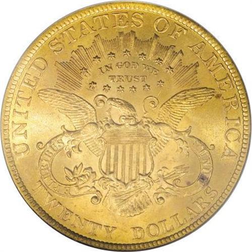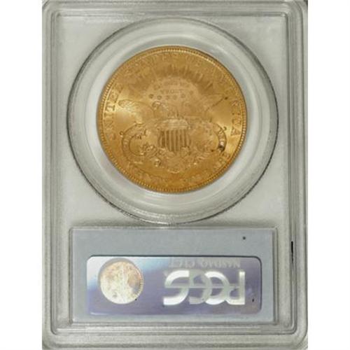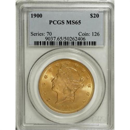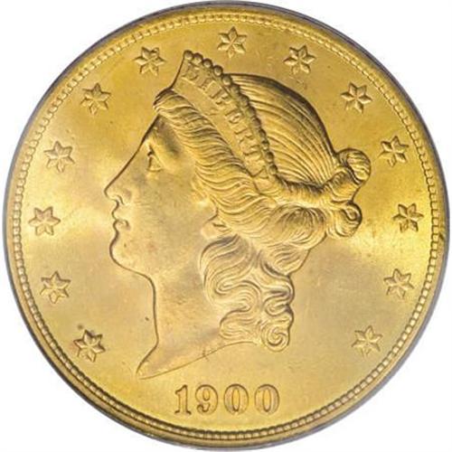 <B>1900 $20 MS65 PCGS.</B></I> A shining and highly attractive example from the final P-mint double eagle issue of the 19th century, boldly impressed with vibrant luster and attractive yellow-orange surfaces. Faint green-tinged copper spots are present near the right side of the scroll in the eagle's talons, though these add character to the piece rather than detracting from it. PCGS has graded just two coins finer (7/07).<BR><BR><B>Coin Engraver:</B> James B. Longacre<BR><BR><b>Shipping:</b> Coins & Currency (<a target="_blank" href="http://www.heritageauctions.com/common/shipping.php">view shipping information</a>\)