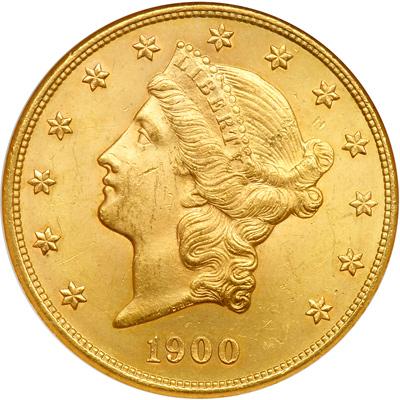 1900 $20. NGC graded MS-63. A nice frosty Uncirculated coin. The surfaces are radiant and each side has a nice veneer of natural light patina that whips and tosses as it alternates between lighter and more mellow shades.