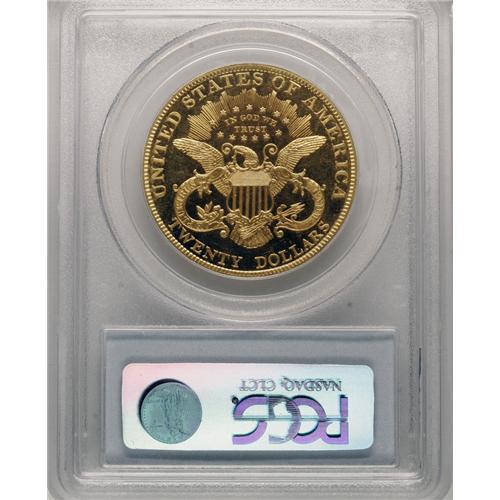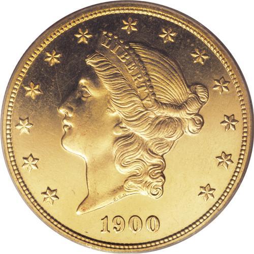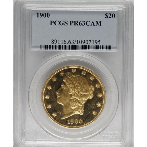 <B>1900 $20 PR63 Cameo PCGS.</B></I> Both sides of this piece are deeply mirrored with the usual watery fields found on all proof gold pieces. The devices are fully detailed with frosty luster and both sides exhibit rich orange-gold color. Although it falls short of Gem quality, this is a desirable proof double eagle with remarkable eye appeal. Originally, the Philadelphia Mint coined 124 proofs of this issue, and about 50 to 60 of those survive today, but many are impaired or damaged, falling far short of this coin. Perhaps half of the survivors have cameo contrast like this piece.<BR><BR><b>Shipping:</b> Coins & Currency (<a target="_blank" href="http://www.heritageauctions.com/common/shipping.php">view shipping information</a>)