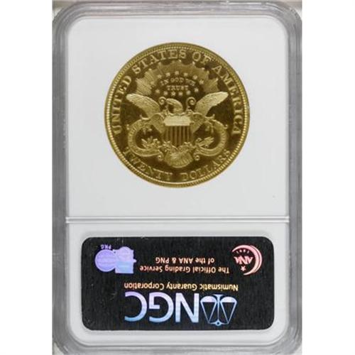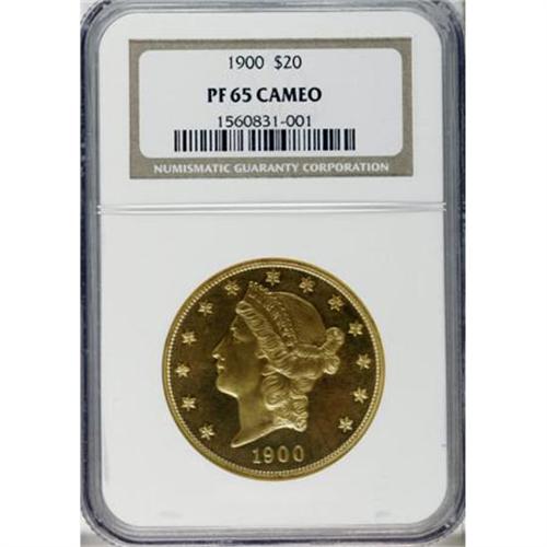 <B>1900 $20 PR65 Cameo NGC.</B></I> Although the Smithsonian Institution has numerous examples of most dates of proof Liberty Head gold double eagles--because of the original Mint Collection, transferred to the Smithsonian, and duplicates added from the Josiah K. Lilly Collection--the 1900 is an exception. The sole example at the Smithsonian is a PR64 piece. The recorded mintage of 124 coins is rather high for a proof Liberty Head double eagle, likely due to those giddy collectors numismatically celebrating what they viewed as the beginning of a new century in 1900. However, many of the known pieces are impaired or damaged in some way.<BR> The 1900 is also an issue that is encountered with and without Cameo surfaces. In PR65 Cameo, this piece is one of seven examples at NGC, with five Cameo coins finer (PR67 the finest). PCGS has certified four PR65 coins as the finest of the issue, all of them Deep Cameo (2/08). The 1900 double eagle is a popular issue for another reason, as it was not long after, in 1902, that the Mint, for reasons that are undocumented today, switched its method of proof gold production. The Liberty Head pieces from 1902 and later, up through 1907, are mostly brilliant, and generally lack the cameo contrast so beloved of collectors today. <BR> This piece has unfathomably deep mirrors with sharply contrasting mint frost over the devices. The surfaces are free from any noticeable or mentionable defects, and each side has slightly hazy. Both obverse and reverse show rich orange-gold color with a slight accent of reddish patina.<BR> It is noteworthy that <I>this stunning Gem proof is the single finest-certified specimen of the issue that we have ever offered</B></I> since we began maintaining our Permanent Auction Archives. The previous offerings of the 1900 ranged from PR64 downward to PR61, with most of those uncertified as Cameo coins.<BR><BR><b>Shipping:</b> Coins & Currency (<a target="_blank" href="http://www.heritageauctions.com/common/shipping.php">view shipping information</a>)