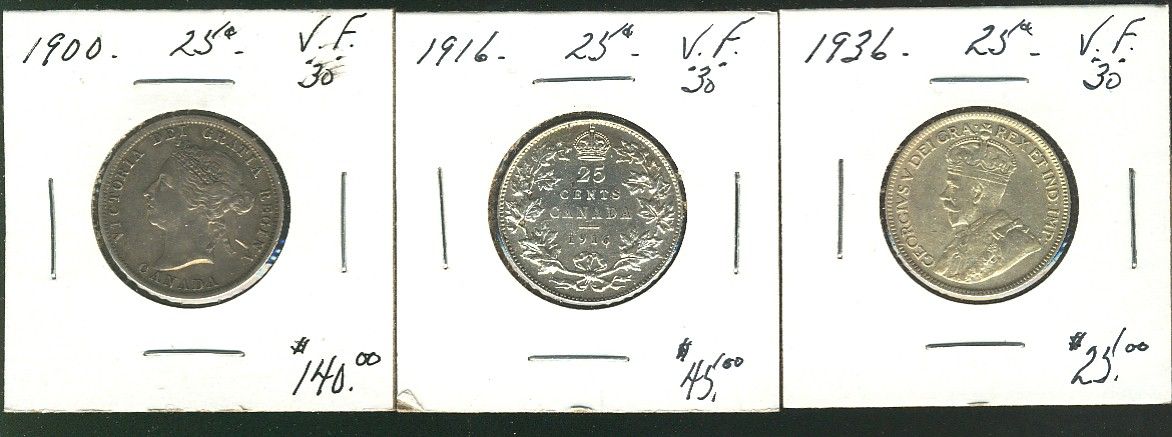 1900 25¢, 1916 & 1936 VF30. Lot of 3 coins. (PBA).