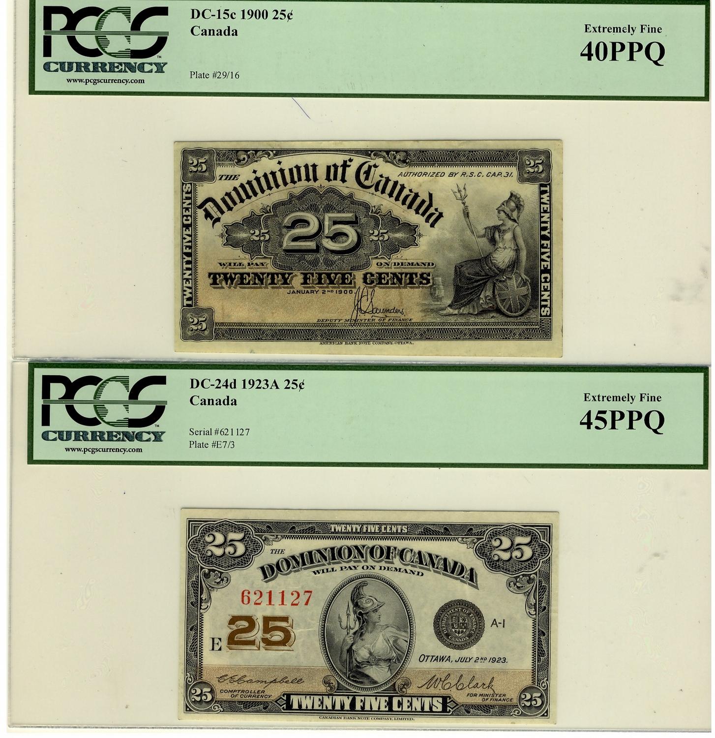 1900 25¢ DC-15c EF40PPQ & 1923 DC-24d EF45PPQ. Lot of 2 notes both PCGS graded.