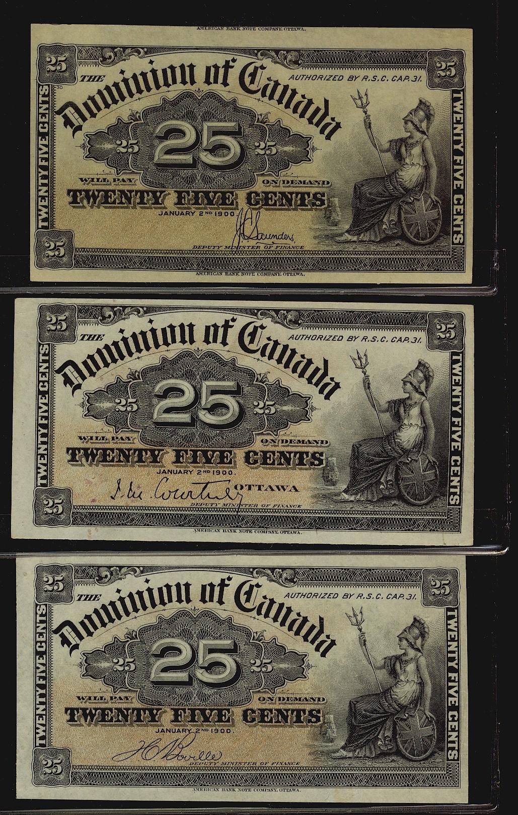 1900 25¢ Shinplasters. Complete Set of 3 notes including DC-15a, DC-15b and DC-15c. EF to AU,