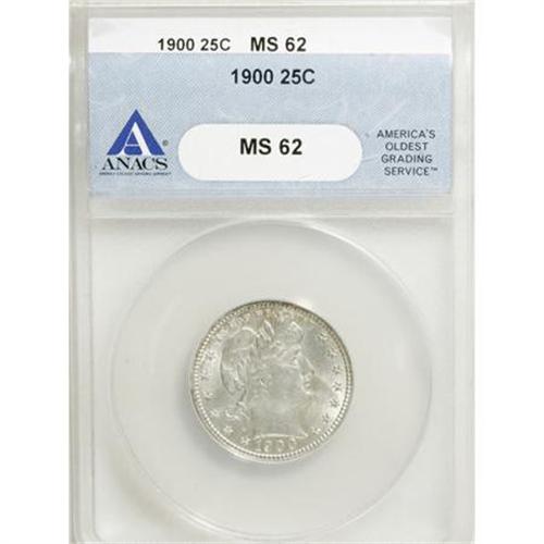 <B>1900 25C MS62 ANACS.</B></I> NGC Census: (18/164). PCGS Population (26/125). Mintage: 10,016,912. Numismedia Wsl. Price for NGC/PCGS coin in MS62: $208. (#5625)<BR><BR><B>Coin Engraver:</B> Charles E. Barber<BR><BR><b>Shipping:</b> Coins & Currency (<a target="_blank" href="http://www.heritageauctions.com/common/shipping.php">view shipping information</a>)