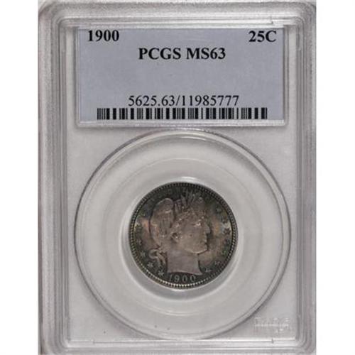 <B>1900 25C MS63 PCGS.</B></I> PCGS Population (37/91). NGC Census: (37/126). Mintage: 10,016,912. Numismedia Wsl. Price for NGC/PCGS coin in MS63: $264. (#5625)<BR><BR><B>Coin Engraver:</B> Charles E. Barber<BR><BR><b>Shipping:</b> Coins & Currency (<a target="_blank" href="http://www.heritageauctions.com/common/shipping.php">view shipping information</a>)
