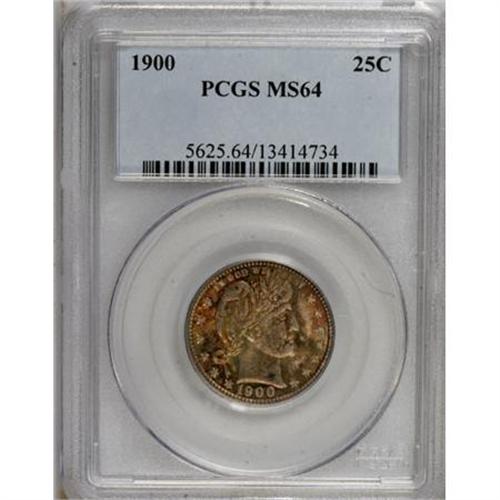 <B>1900 25C MS64 PCGS.</B></I> PCGS Population (44/42). NGC Census: (89/37). Mintage: 10,016,912. Numismedia Wsl. Price for NGC/PCGS coin in MS64: $472. (#5625)<BR><BR><B>Coin Engraver:</B> Charles E. Barber<BR><BR><b>Shipping:</b> Coins & Currency (<a target="_blank" href="http://www.heritageauctions.com/common/shipping.php">view shipping information</a>)
