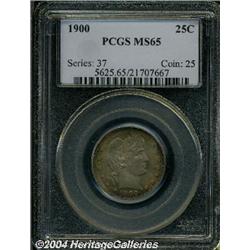 <B>1900<25C> MS65 PCGS.</B></I> Golden-gray patination shows touches of pale green and yellow, particularly on the reverse. Nicely struck, with no significant marks. Population: 20 in 65, 13 finer (9/04). <BR><BR><B>Important notice:</B> Heritage usually auctions material at the rate of 200-250 lots per hour. On some occasions eBay Live bid software or the Internet may not be able to keep up with the pace of the auction. We recommend placing a realistic absentee bid now as insurance to avoid disappointment. Occasionally the auctioneer may eliminate or reject an eBay Live bid, and the auctioneer may also reopen a lot after the close of the eBay live bidding (usually because we missed an audience bid), and may reject your bid even if it shows you as the winning bidder. By bidding via eBay Live, you agree that Heritage may award the lot to another bidder at its sole discretion under the circumstances described above or any other reasonable circumstances. Since eBay bids are not shown to us until we open the lot on the floor, we treat those bids just like floor bids. In most cases the floor responds before the eBay bid is presented to us, due to Internet lag time, so for consistency we have made it a policy that floor bids are always considered first over tie eBay live bids. Also please note that all Heritage lots purchased through eBay Live carry a 20% Buyer's Premium. Please make sure you read the Terms and Conditions before you bid.