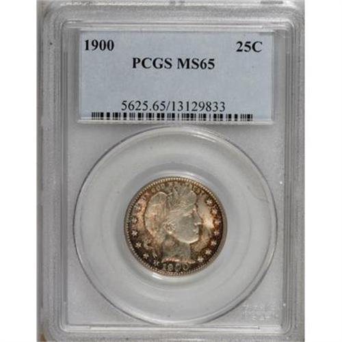 <B>1900 25C MS65 PCGS.</B></I> A terrific Gem type coin from this popular turn-of-the-century year. Fully struck, much of each side is brilliant still, but almost as much of each side shows an accent of deep reddish-russet toning. Remarkably smooth over the cheek of Liberty and problem-free elsewhere. A lustrous example.<BR><BR><B>Coin Engraver:</B> Charles E. Barber<BR><BR><b>Shipping:</b> Coins & Currency (<a target="_blank" href="http://www.heritageauctions.com/common/shipping.php">view shipping information</a>)