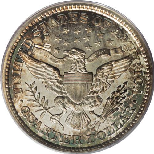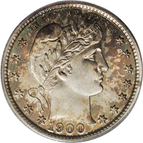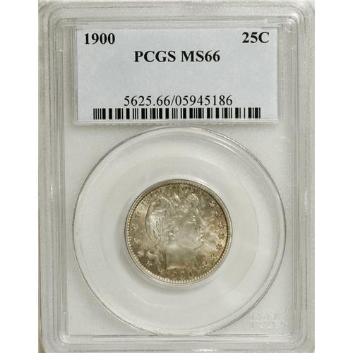 <B>1900 25C MS66 PCGS.</B></I> The Philadelphia Mint produced over 10 million circulation strike quarters in 1900, making the issue a relatively common date. Premium Gems, however, such as the one in the present lot, are anything but common. PCGS and NGC have graded only 15 MS66 pieces, and six examples finer. Splashes of sky-blue, lavender, and golden-tan patina visit highly lustrous surfaces, being somewhat more prevalent on the obverse. All of the design features are sharply struck, and just a few grade-consistent marks occur on each side. Population: 8 in 66, 2 finer (3/07).<BR><BR><b>Shipping:</b> Coins & Currency (<a target="_blank" href="http://www.heritageauctions.com/common/shipping.php">view shipping information</a>)