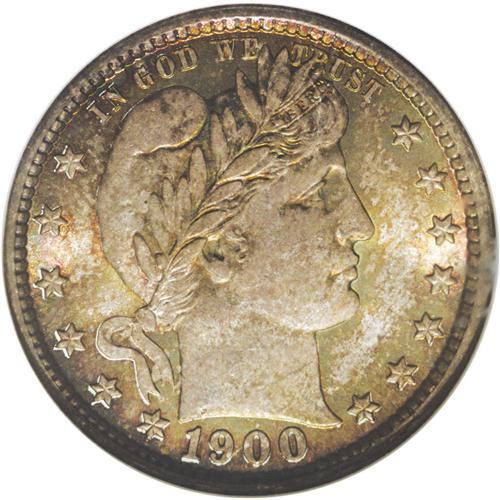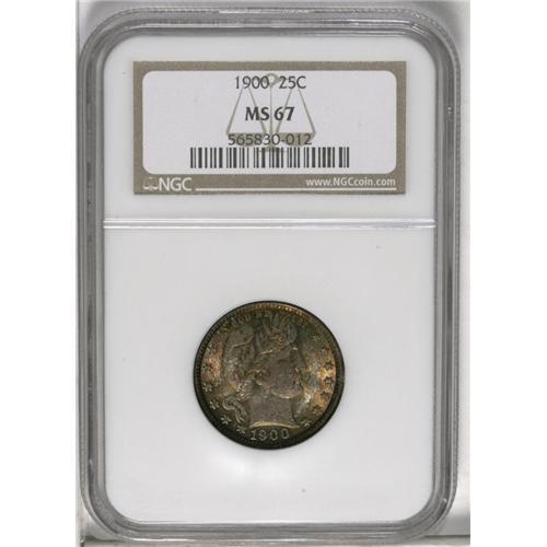 <B>1900<25C> MS67 NGC.</B></I> Dramatic orange-red, gold, and lime coloration embraces this pinpoint-sharp and thoroughly lustrous Superb Gem. Only a solitary, nearly imperceptible slide mark on the cheek precludes an even finer grade. The 1900 is collectible in middle Mint State grades, but the certified population dwindles drastically above the MS65 level. Census: 3 in 67, 1 finer (6/06).<BR><I>From The Belle Glade Collection.</B></I>