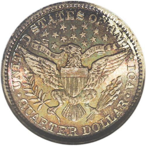 1900 25C MS67 NGC. Dramatic orange-red, gold, and lime