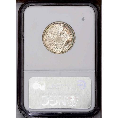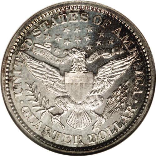 <B>1900<25C> PR62 NGC.</B></I> Dappled cobalt-blue and olive-brown coloration over both sides is joined by a swath of rainbow toning along the lower left (facing) obverse border, and all of the design elements are well brought up. Some wispy handling marks are noted on Liberty's cheek and neck. A total of 912 proofs were struck this year.
