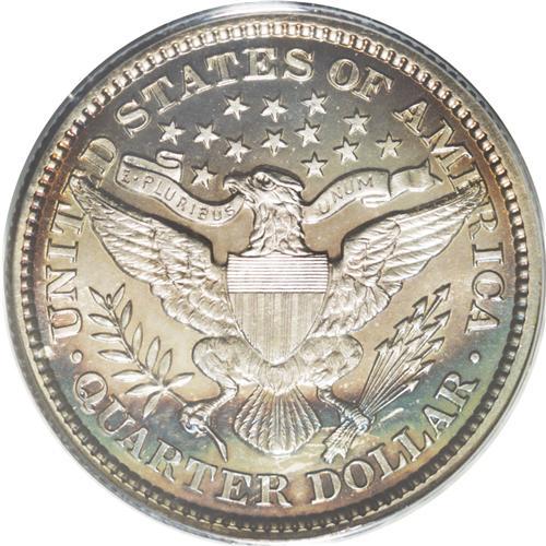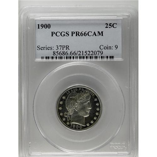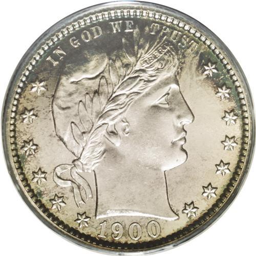 <B>1900<25C> PR66 Cameo PCGS.</B></I> This beautiful Proof Barber Quarter displays a lovely arc of cobalt-blue toning on the upper obverse rim, and a ring of olive-champagne toning on the reverse that is enhanced by splashes of violet and electric-blue. The devices display moderate frostiness which, combined with the mark-free reflective fields, lends a suitable cameo effect. A beautiful coin at a seldom-seen grade level. Population: 5 in 66 Cameo, 5 finer (6/06).<BR><I>From The Belle Glade Collection.</B></I>