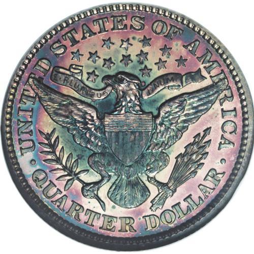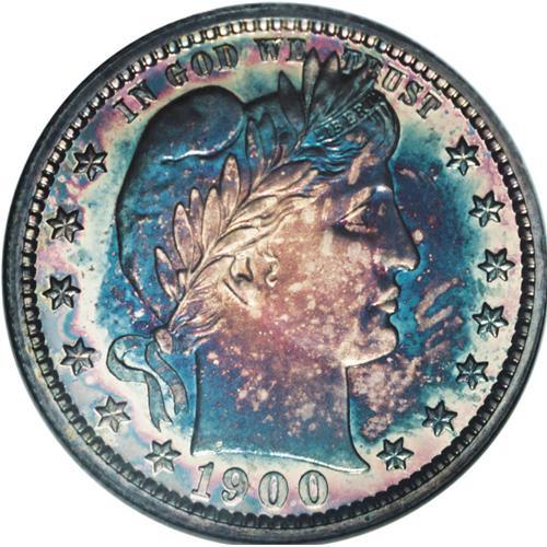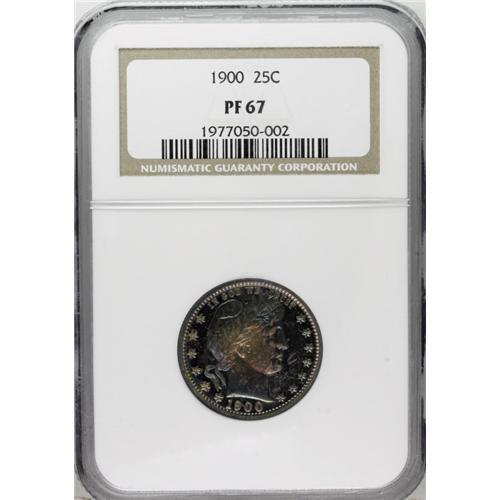 <B>1900 25C PR67 NGC.</B></I> Exquisite target toning in concentric rings of pinkish-silver, iridescent blue, and heather grace this immaculate and needle-sharp Superb Gem. The piece is distraction-free, even under a high-powered loupe. A nice one, from the proof emission of only 912 pieces. Census: 14 in 67, 8 finer (12/06).<BR><BR><b>Shipping:</b> Coin/Currency (<a target="_blank" href="http://www.heritageauctions.com/common/shipping.php">view shipping information</a>)