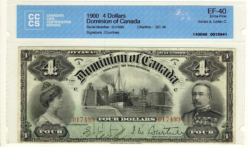 1900 $4 DC-16 #017499 CCCS EF40. Vibrant colours, scarce and seldom offered.