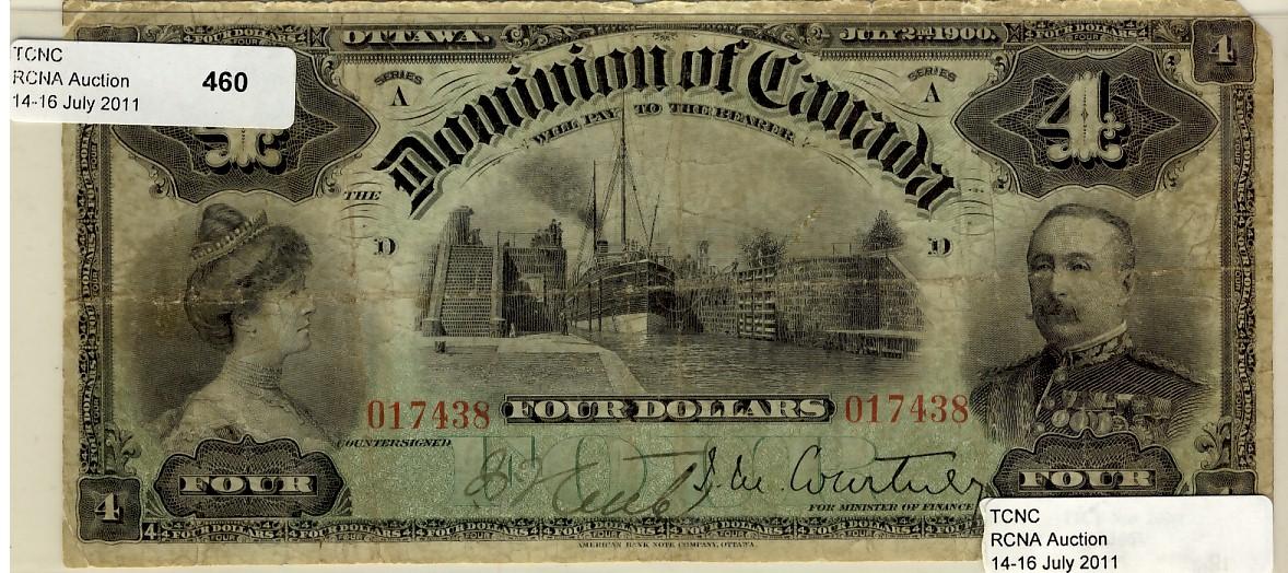 1900 $4 DC-16. A nice VG to Fine example with missing top right corner. Should be viewed.