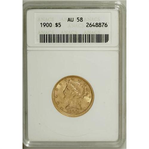 <B>1900 $5 AU58 ANACS.</B></I> NGC Census: (329/9698). PCGS Population (550/5758). Mintage: 1,405,730. Numismedia Wsl. Price for NGC/PCGS coin in AU58: $196. (#8400)<BR><BR><B>Coin Engraver:</B> Christian Gobrecht<BR><BR><b>Shipping:</b> Coins & Currency (<a target="_blank" href="http://www.heritageauctions.com/common/shipping.php">view shipping information</a>\)