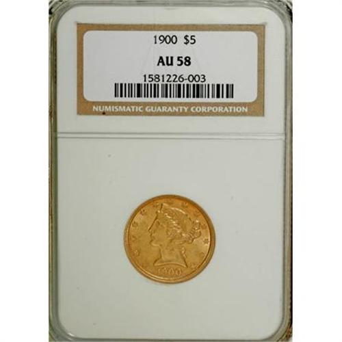 <B>1900 $5 AU58 NGC.</B></I> NGC Census: (344/9988). PCGS Population (567/5910). Mintage: 1,405,730. Numismedia Wsl. Price for NGC/PCGS coin in AU58: $190. (#8400)<BR><BR><B>Coin Engraver:</B> Christian Gobrecht<BR><BR><b>Shipping:</b> Coins & Currency (<a target="_blank" href="http://www.heritageauctions.com/common/shipping.php">view shipping information</a>)