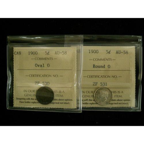 1900 5¢ ICCS AU58, lot of two coins, Oval and Round 0 both same grade.