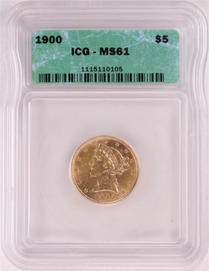 One 1900 $5 Liberty Head Half Eagle Gold Coin ICG MS61. ICG Certified.